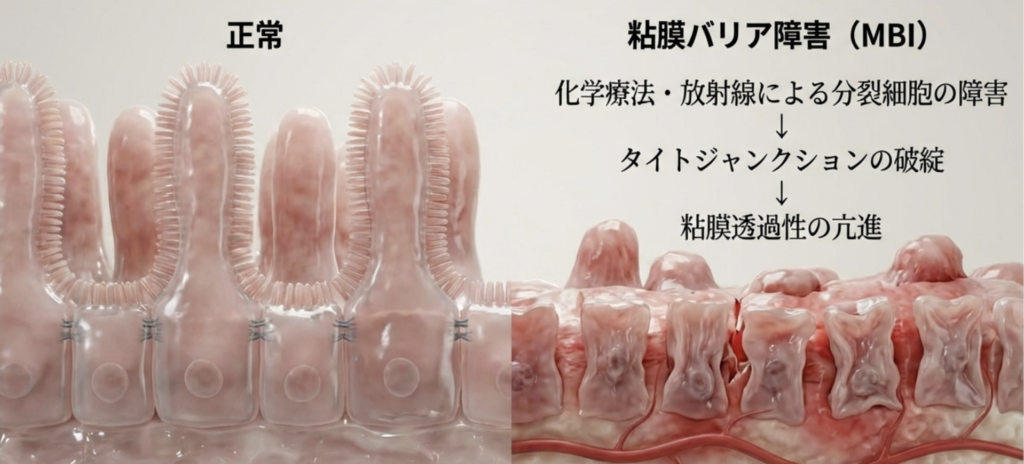 MBIが生じると、細胞間を結ぶタイトジャンクションが破綻し、粘膜透過性が亢進します。