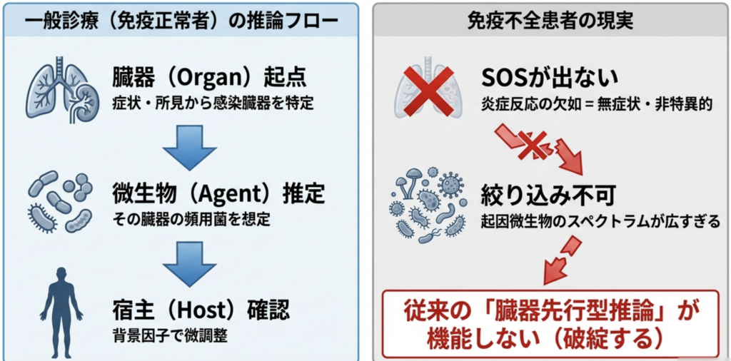 このため、「感染臓器」「病原微生物」「患者背景」という三要素で感染症を捉える枠組みは、免疫不全患者では機能しにくい状況が頻発します。